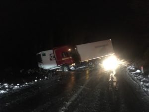 sempre a causa di un incidente. Un camion (nella foto) si è ribaltato e ostruisce il passaggio. Viene consigliato di prestare la massima atenzione per il pericolo di formazione di ghiaccio lungo le arterie, a seguito del maltempo.