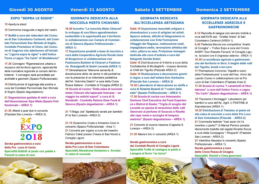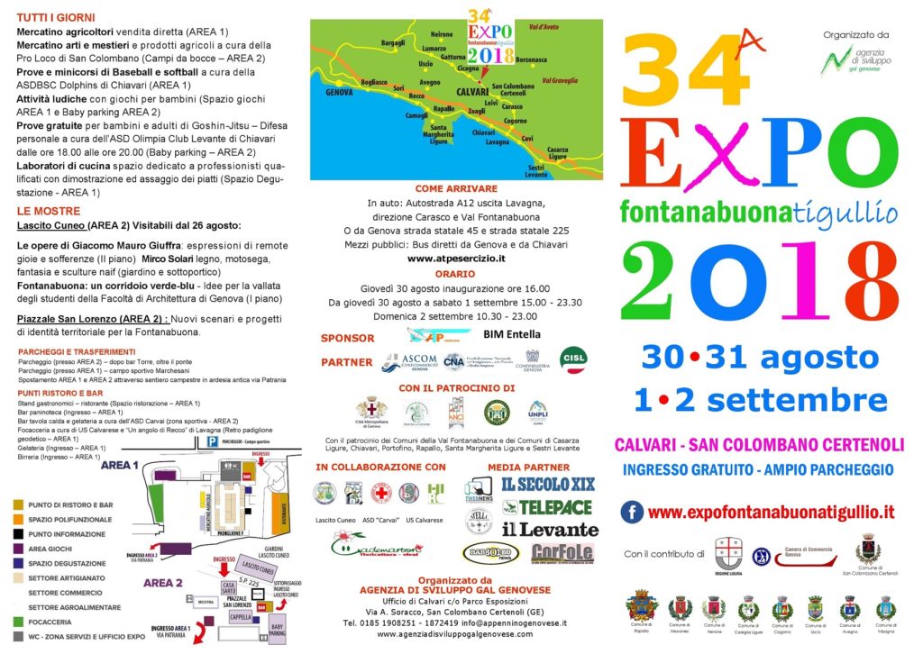 San Colombano Certenoli. Prosegue fino a domenica sera la 34a Expo Fontanabuona Tigullio nel parco esposizioni di Calvari, a San Colombano Certenoli. Gli stand espositivi fino a domani sono aperti dalle ore 15.00 alle 23.30, domenica 2 settembre l’orario è 10.30-23.00.
