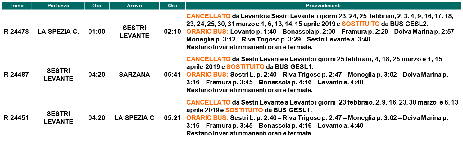 Sestri Levante. Trenitalia fa sapere che stanno per svolgersi lavori usi binari e, “per consentire le attività del cantiere tre treni regionali, in alcune notti tra il 23 febbraio e il 15 aprile 2019, saranno cancellati e sostituiti con bus tra Levanto e Sestri Levante.