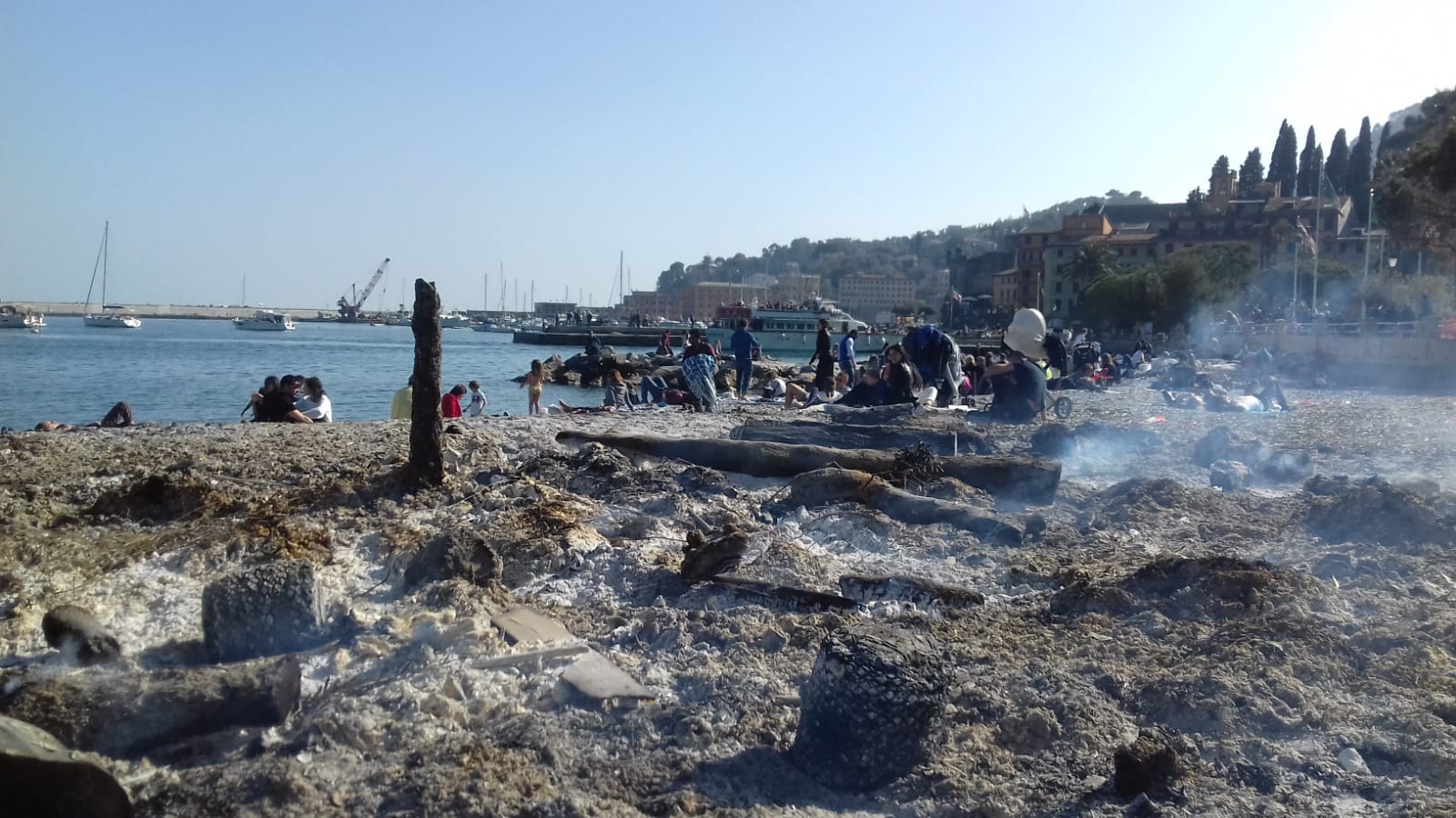 Il falò della festa di ieri sera ancora fuma, dietro ai primi bagnanti della stagione sulla spiaggia di Ghiaia: