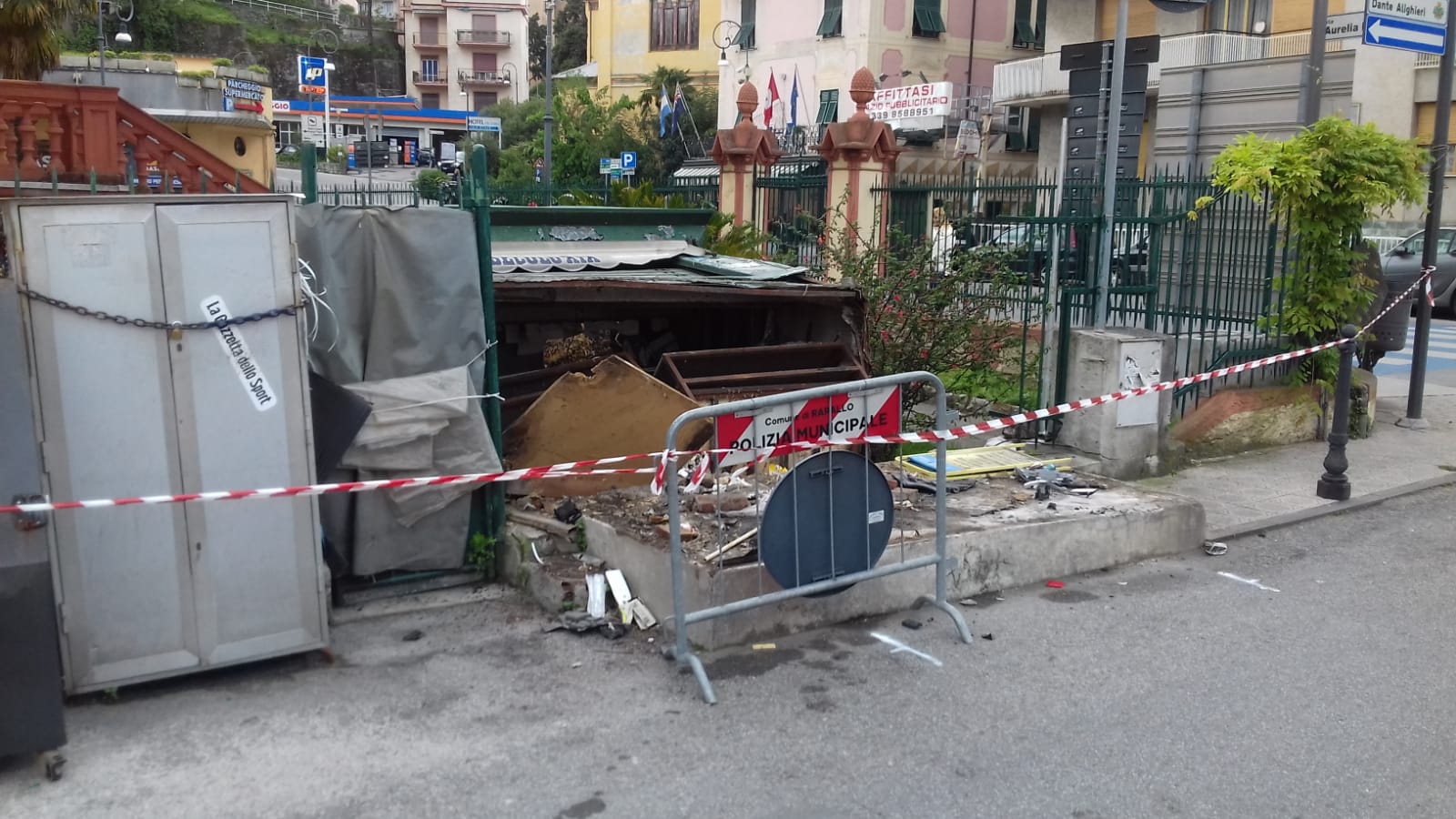 Una delle due vetture è finita contro il chiosco dell’edicola che si trova all’angolo di Villa Queirolo, e lo ha letteralmente ribaltato.