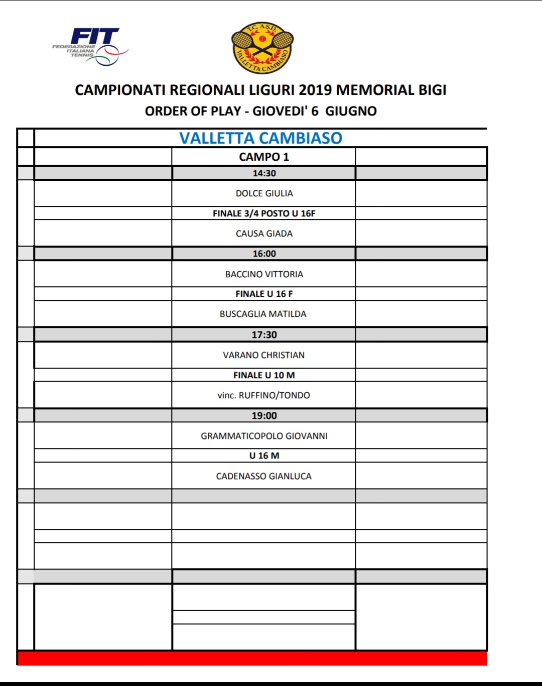 Partita combattuta quella fra lo spezzino, mancino, Arthur Tom Mammi e il genovese Simone Berlingieri (U13). I confronti diretti erano pari (1-1) e lo scorso anno, sempre in semifinale aveva vinto Mammi. Il match di questa sera si è concluso in due set: 6/1, 7/6. Molto intensa la seconda partita nella quale Berlingieri é rimasto incollato all’avversario. Nel tiebreak, però, ha concesso troppo e Mammi, gia campione regionale lo scorso anno, ha avuto la meglio per 7 a 1. E domani, fra le quattro partite in programma ci sono due finali, una delle quali vedrà in campo la sammargheritese Matilda. Buscaglia (U16).