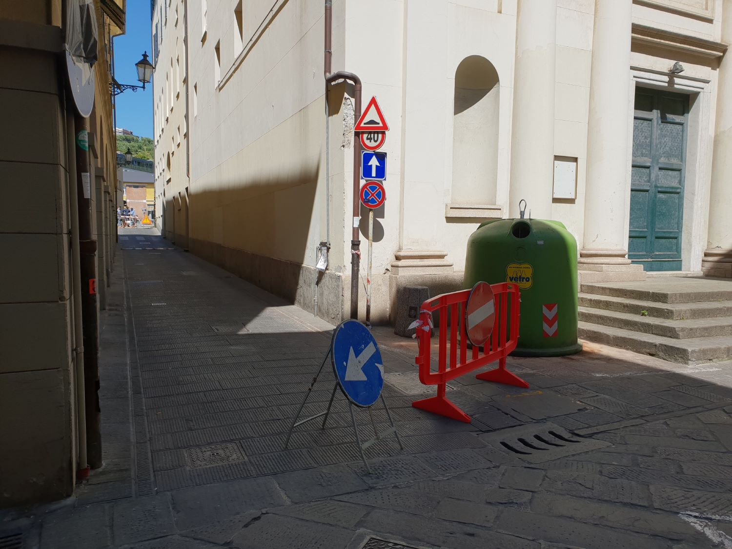 Chiavari. La rotonda di Via Prandina non è l’unica novità di queste ore nella viabilità di Chiavari. Come preannunciato, infatti, da ieri è stato chiuso al traffico il tratto di Via delle Vecchie Mura tra Via Raggio e Via Marana. La situazione della viabilità del centro storico rimarrà, per alcuni giorni, quella delle nostra immagini, necessaria per lo svolgimento dei lavori sul posto.