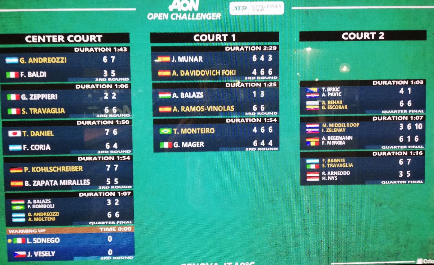 Le raffiche di vento fanno volare la terra rossa in un Centrale praticamente senza pubblico fuggito per il maltempo. Con i tennisti che proseguono il match attendendo la decisione del giudice di sedia e del Supervisor di sospendere il confronto. Tre game sono stati giocati nell’arco di 29 minuti, quando in pratica il vento calava di intensità. Il Challenger di Genova ha vissuto una serata difficile oltre che per il vento anche per l’illuminazione di un campo che faceva le bizze (era accaduto anche lo scorso anno).