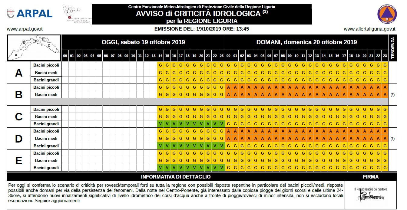 Sulla zona centrale della regione, compreso il Golfo Paradiso, dalla mezzanotte prossima e sino alle 23.59 di domani diventa arancione ma i bacini grandi rimangono gialli.
