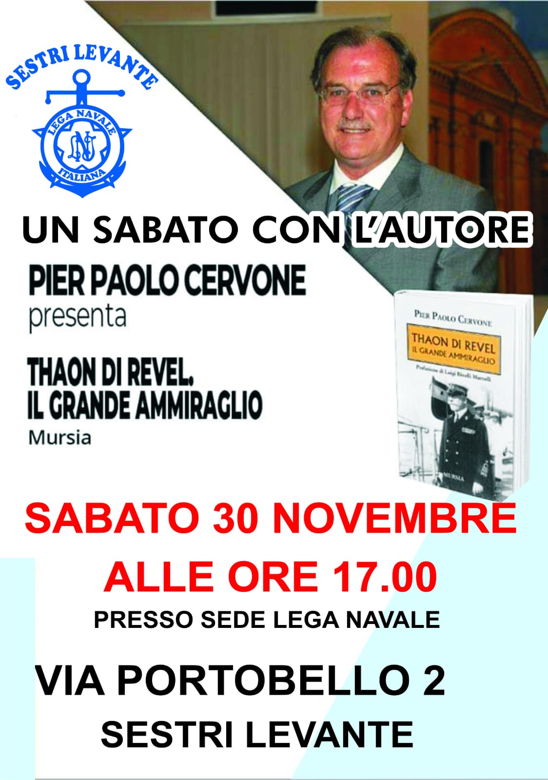 Il giornalista e scrittore Pier Paolo Cervone, già caposervizio della Stampa e autore di numerosi volumi dedicati ai personaggi e alle vicende della Prima Guerra mondiale, sarà ospite nel pomeriggio di oggi, sabato della Lega Navale di Sestri Levante (via Portobello 2, ore 17, ingresso libero) per presentare la sua ultima fatica: il volume “Thaon di Revel il grande ammiraglio” (Mursia, 196 pagine, 18 euro). A fare gli onori di casa il presidente della Lega Navale sestrese Massimo Manzi.