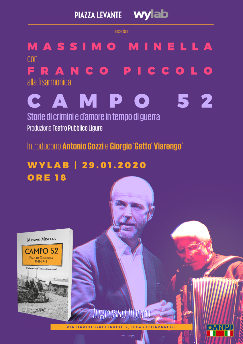 È diventato un libro il racconto di Massimo Minella, che per Teatro Pubblico Ligure ha debuttato con successo il 16 luglio 2018 allo “Scali a mare Pieve Ligure Art Festival” e il 5 luglio 2019 è andato in scena nel luogo dove si sono svolti i fatti: Coreglia, un paese tra i monti dell’Appennino, alle spalle di Chiavari. Il volume Campo 52. Pian di Coreglia 1941-1944 di Massimo Minella, edito da Mursia con la prefazione di Tomaso Montanari, sarà presentato mercoledì 29 gennaio (ore 18) presso Wylab, in via Davide Gagliardo 7 a Chiavari (Genova), in collaborazione con il settimanale online ‘Piazza Levante’. Introdotti da Antonio Gozzi, editore di ‘Piazza Levante’, lo storico Giorgio Getto Viarengo e il musicista Franco Piccolo saranno in dialogo con l’Autore. L’ingresso è libero.