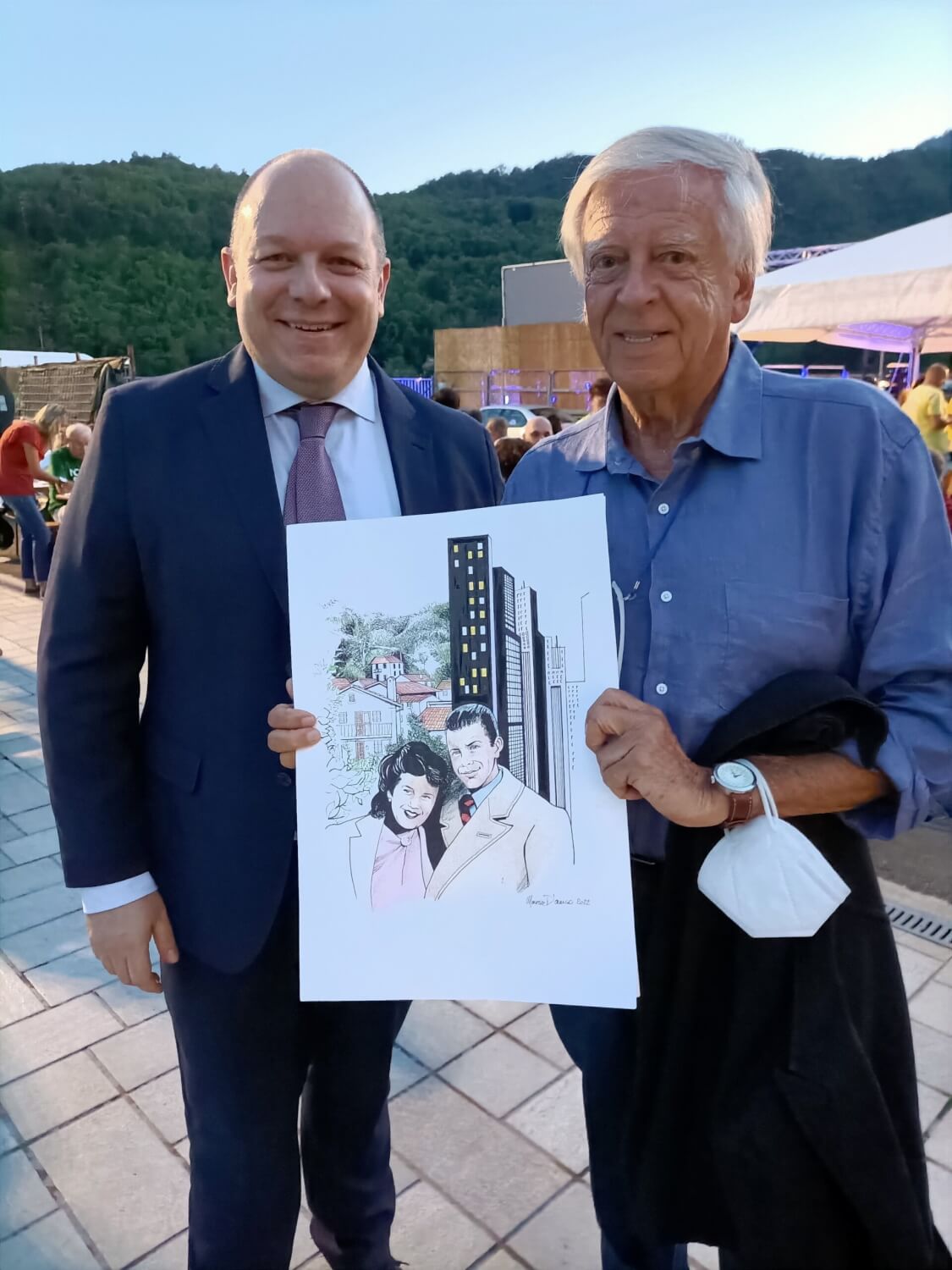 Lumarzo. Dopo la targa con la quale il Comune di Lumarzo , in Val Fontanabuona, intitolò nel dicembre 2015 la sala consiliare a Natalina “Dolly” Garaventa, la mamma di Frank Sinatra, nel giorno del centenario della nascita di The Voice, anche un dipinto arricchirà nei prossimi giorni l’orgoglio della comunità fontanina per la stretta vicinanza con il più grande artista del Novecento. Lo ha ricevuto ufficialmente in dono, nel corso della quindicesima edizione della manifestazione “Hello Frank!” giovedì sera, il sindaco di Lumarzo Daniele Nicchia dall’artista e disegnatore romano Mauro D’Amico, autore di tanti manifesti cinematografici.