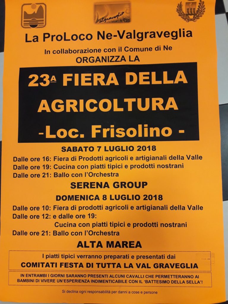 Ne. Termina stasera la Fiera dell’Agricoltura, a Frisolino di Ne, in Valgraveglia. E’ giunta alla 23esima edizione ed è organizzata dalla locale Pro Loco. Si può visitare la fiera dei prodotti agricoli della valle, e gli stand gastronomici aprono alle 19. Dalle 0re 21 si balla con l’orchesta Alta Marea.