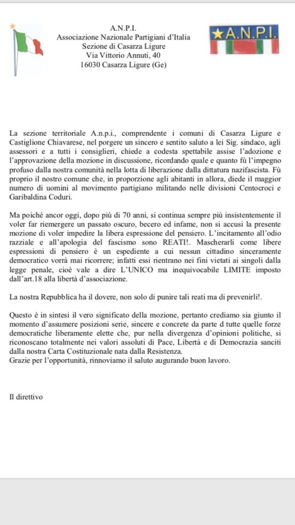 Casarza Ligure. Ancora strascichi dopo che il consiglio comunale di Casarza Ligure ha respinto la mozione per il divieto di spazi alle manifestazioni riconducibili al pensiero fascista. L’Associazione Nazionale Partigiani Cristiani – sezione Sestri Levante e Tigullio, in una nota, sostiene che le polemiche che ne sono nate “ dimostrano la fondatezza delle preoccupazioni già […]