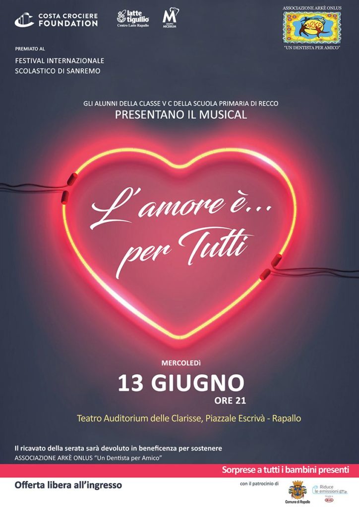 Rapallo. “L’amore è…per tutti”. E’ il titolo del musical che gli alunni della classe quinta C della primaria di Recco porteranno in scena mercoledì 13 giugno alle 21, al teatro delle Clarisse di Rapallo. Il musical è stato premiato al Festival internazionale scolastico di Sanremo e il ricavato della serata sarà devoluto all’associazione Arkè Onlus […]