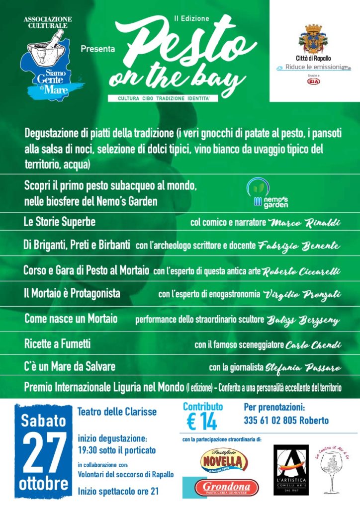 Rapallo. Si terrà sabato prossimo, 27 ottobre, dalle 19.30, all’auditorium delle Clarisse di Rapallo, la seconda edizione di Pesto on the Bay, l’evento culturale “fra gastronomia e teatro – come dicono gli organizzatori – che coinvolge i cinque sensi, organizzato dall’associazione “Siamo gente di mare molto diversa da un mare di gente”, con la partecipazione […]