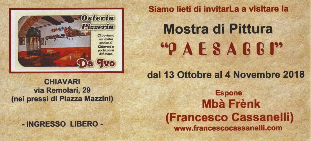 Chiavari. Nuova mostra per il pittore Francesco Cassanelli. Questa volta l’artista espone a Chiavari dall’Osteria “Da Ivo”, in via Remolari. Titolo della personale “Paesaggi”. Le sue opere si possono vedere da sabato 13 ottobre a domenica 4 novembre. L’ingresso è libero e osserva gli orari di apertura del ristorante.