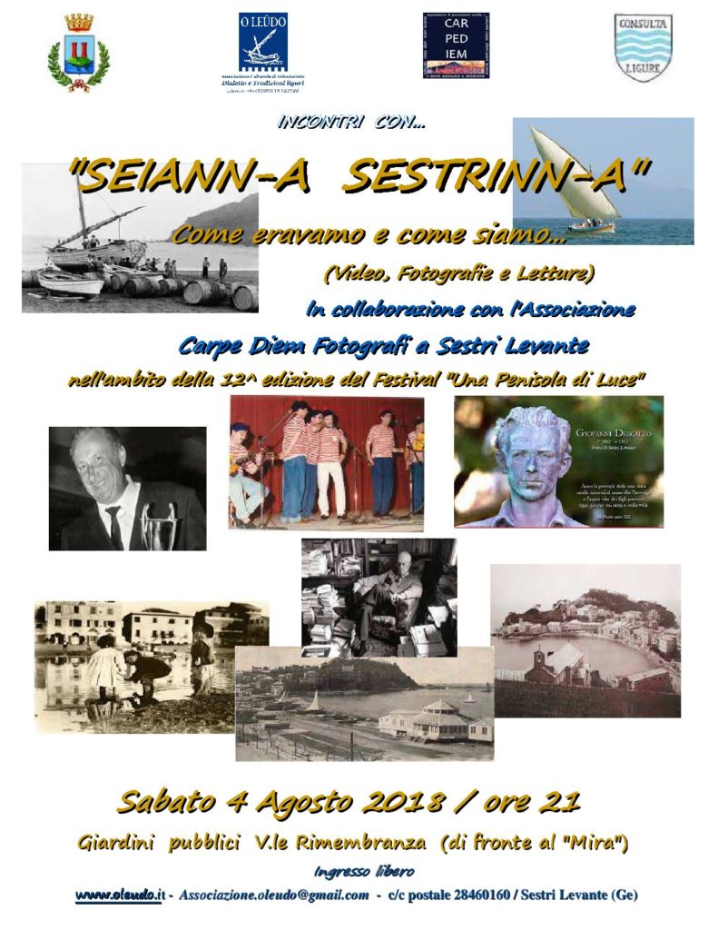 Sestri Levante. “Seiann-a Sestrinn-a” sabato 4 agosto nei giardini pubblici di viale Rimembranza, di fronte al Mira. “Come eravamo e come siamo…” l’argomento dell’evento, organizzato con video, fotografie e letture dall’associazione “O Leûdo” in collaborazione con l’associazione Carpe Diem nell’ambito della 12^ edizione del Festival “Una Penisola di Luce”.