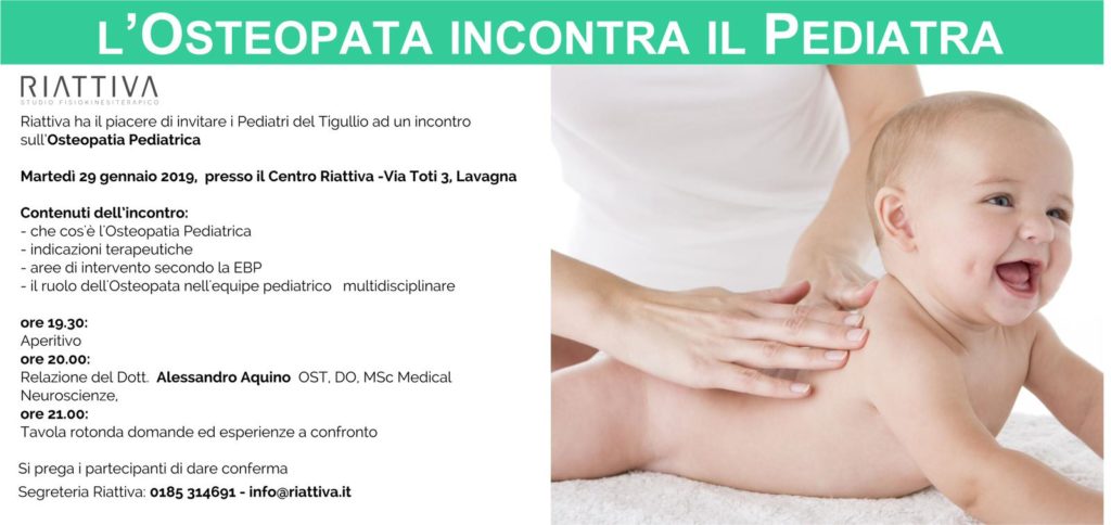 Lavagna. Il centro Riattiva di Lavagna invita nella propria sede i pediatri della zona e quanti vogliano partecipare, per un incontro sulla osteopatia pediatrica, nella prima serata di oggi, 29 gennaio. Si comincia alle 19.30 con l’aperitivo, poi, dalle 20, la relazione del dottor Alessandro Aquino, seguita da tavola rotonda.