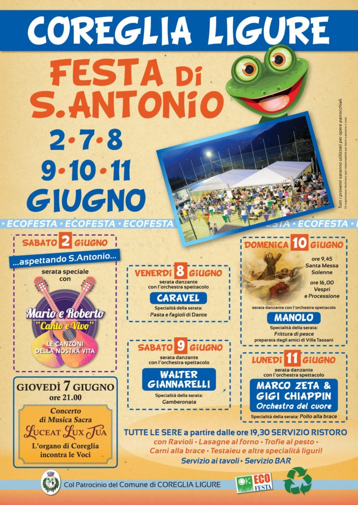 Coreglia Ligure. Anche quest’anno anticipa la festa di Sant’Antonio a Coreglia Ligure. Sabato prossimo, 2 giugno, “Canto e vivo – Le canzoni della nostra vita”, lo spettacolo di Mario e Roberto, come sempre sul campetto sportivo di Coreglia e come sempre con servizio ristoro dalle 19,30, in versione “Ecofesta” e quindi con stoviglie, piatti e […]