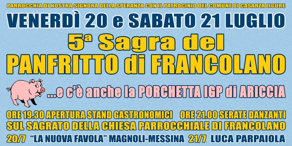 Casarza Ligure. La sagra del panfritto di Francolano taglia il traguardo della quinta edizione e torna venerdì 20 e sabato 21 luglio, sul sagrato della chiesa di Nostra Signora della Speranza, promossa dalla parrocchia. Gli stand gastronomici aprono, entrambe le sere, alle 19.30, con piatto forte, oltre al panfritto che potrà essere degustato con salumi e […]