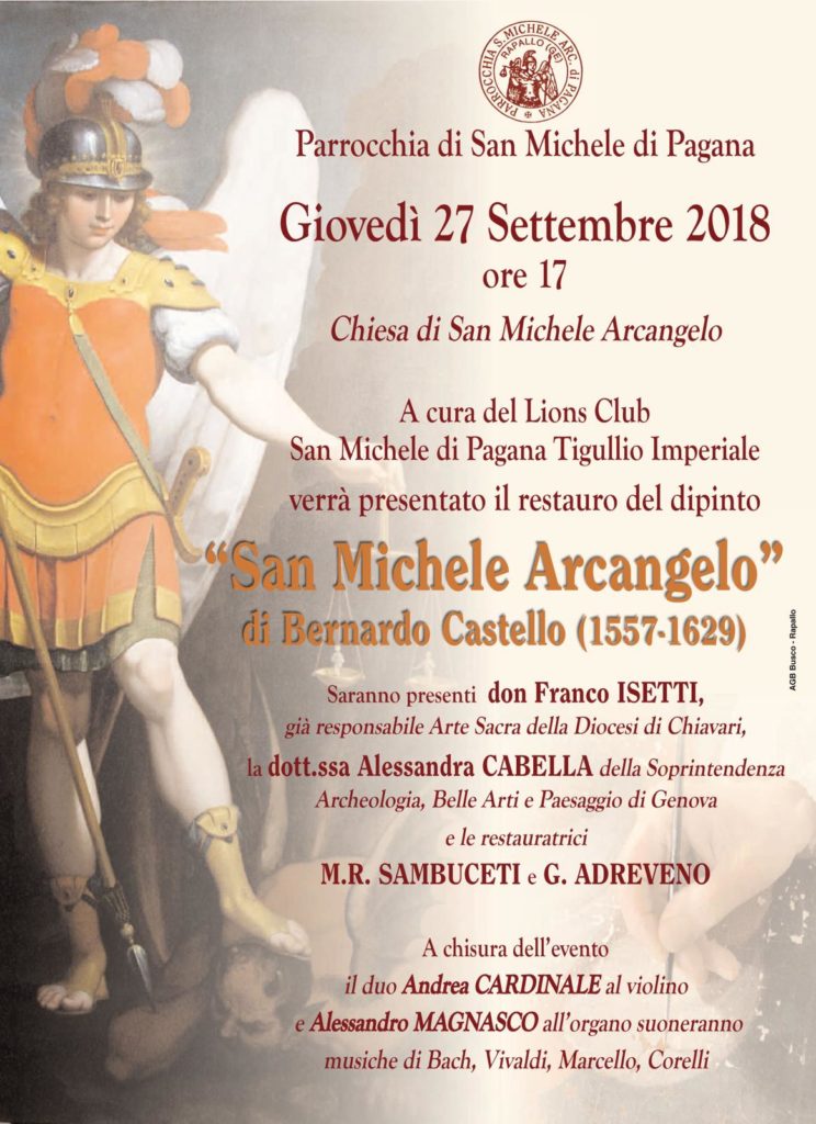 Rapallo. Oggi, giovedì 27, nella chiesa di San Michele di Pagana, verrà presentato, dopo il restauro, il quadro di San Michele Arcangelo, di Bernardo Castello, pittore vissuto a cavallo tra XVI e XVII secolo. Il restauro è stato curato dal Lions Club San Michele di Pagana – Tigullio Imperiale. Saranno presenti: don Franco Isetti, già […]