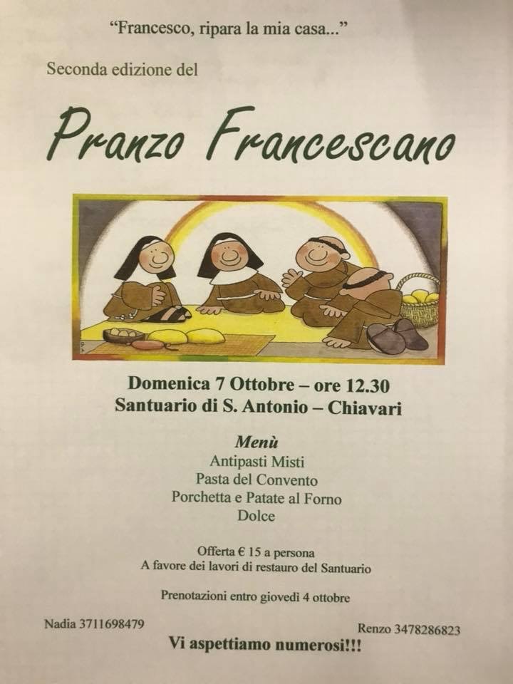 Chiavari. Ecco il programma delle celebrazioni di San Francesco, al santuario di Sant’Antonio di Chiavari. Momento conclusivo sarà un pranzo, domenica prossima, con raccolta fondi per il restauro dello stesso santuario. Programma delle Celebrazioni Dal lunedì 1 a mercoledì 3 ottobre ore 17.30 triduo di preparazione Giovedì 4 ottobre Ore 16.30 benedizione degli animali domestici […]