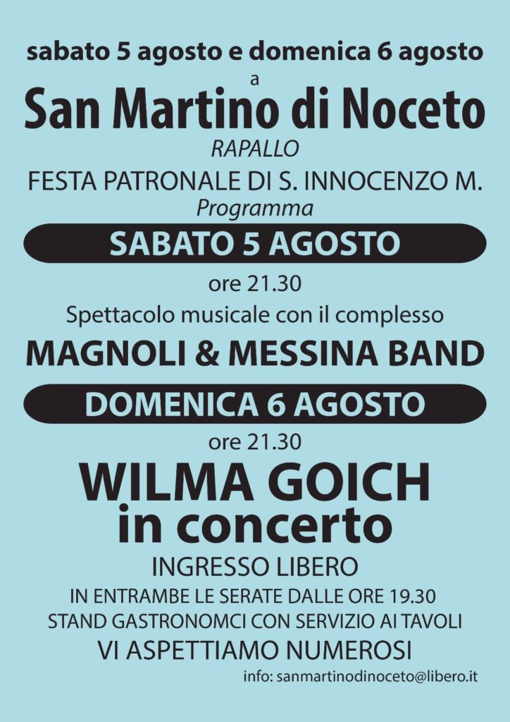 Rapallo. Festa patronale di San Innocenzo Martire, a San Martino di Noceto, sulle alture di Rapallo. Il programma prevede sabato 5 agosto lo spettacolo musicale con “Magnoli & Messina Band”, dalle 21.30. Domenica 6 agosto, stessa ora, ci sarà il concerto di Wilma Goich. L’ingresso è libero. Gli stands gastronomici con servizio ai tavoli aprono […]