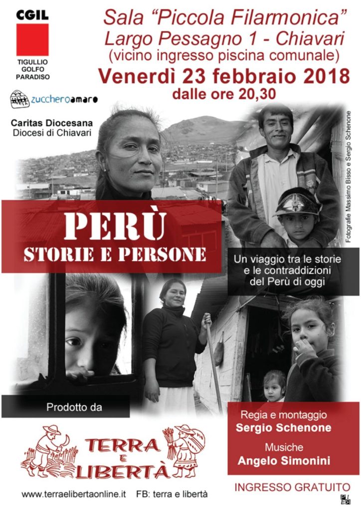 Chiavari. “Perù storie e persone- Un viaggio tra le storie e le contraddizioni del Perù di oggi” è l’appuntamento organizzato per venerdì, 23 febbraio, alle 20.30, nell’auditorium di Largo Pessagno (vicino all’ingresso della piscina) a Chiavari, da Cgil, Zucchero Amaro, Caritas diocesana. Sarà proiettato il documentario prodotto da Terra e Libertù, con regia e montaggio […]